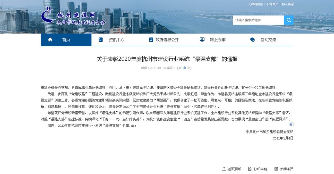 1月4日,122cc太阳成集团入口市建委党组通报表彰一批2020年度市建设行业系统“最强支部”(机关、事业、两新组织类8个,工地项目类30个),临丁路(秋石高架东侧—余杭区界)提升改造工程项目联合党支部、东新路(环城北路—同协路)整治工程临时党支部光荣上榜。 为进一步深化“党建双强”工程建设,...