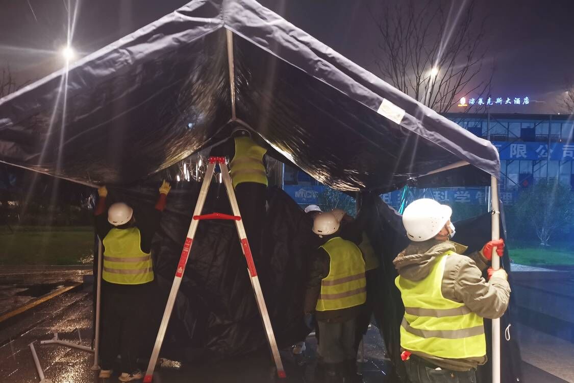 疫情就是命令,防控就是责任。1月27日晚至28日凌晨,太阳tyc集团5997公司积极响应杭州市拱墅区住建局新冠肺炎疫情防控相关任务,迅速行动、紧急抽调东新路(环城北路—同协路)整治工程、华丰单元XC1003-R21-01地块拆迁安置房工程项目部40多名施工人员,冒雪驰援东新街道某酒店隔离点,连夜突击安装户外帐篷和室内木板隔墙等设施,奋战5个多小时,圆满完成任务,受到有关领导及医务人员的衷心感谢和高度评价。