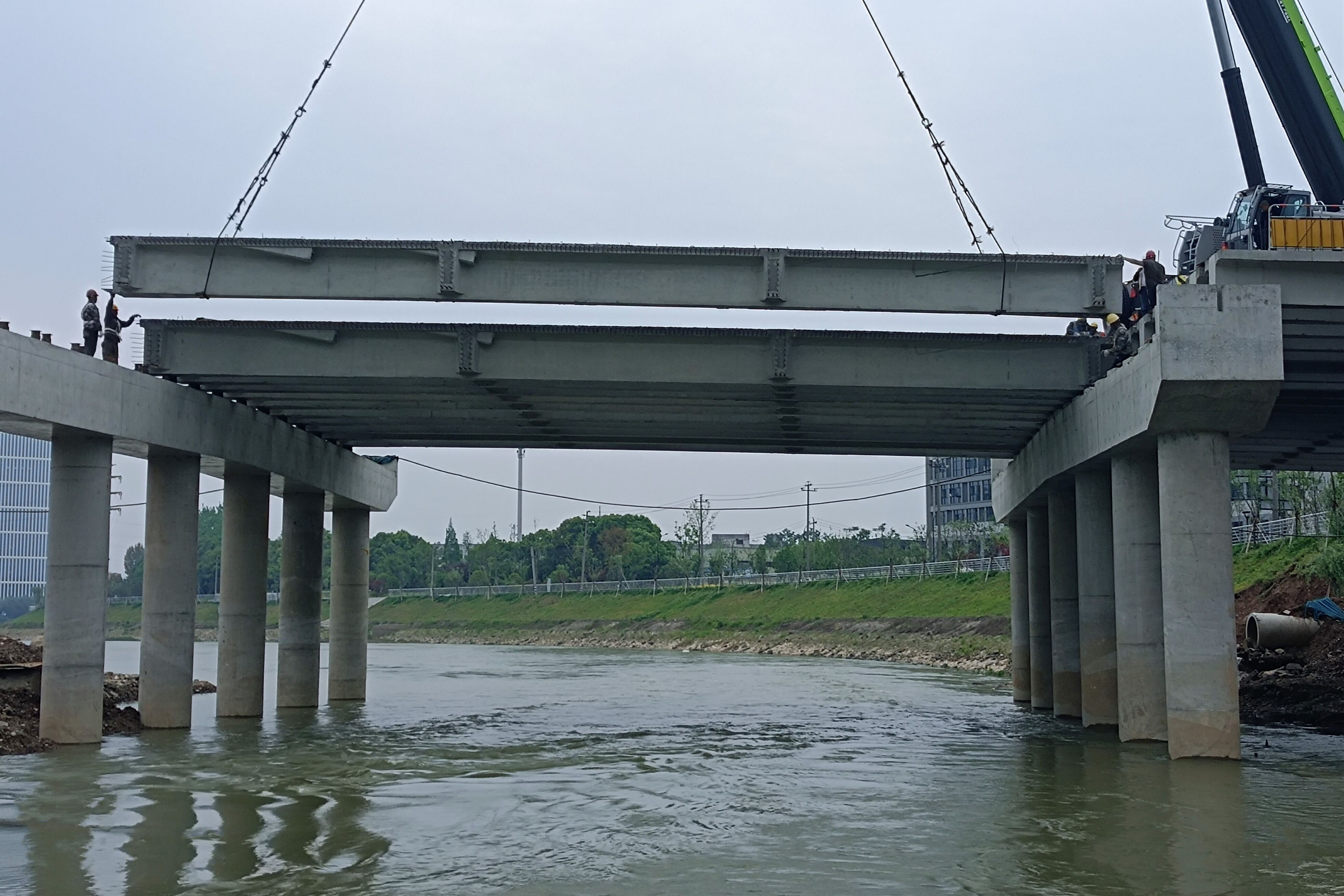4月20日下午4时,随着最后一片梁板架设到位,标志着自4月13日开始实施的太阳集团0638总站青山湖科技城发达路跨南苕溪桥梁及接线工程共95片梁板架设任务全部安全完成,实现重要节点目标。
