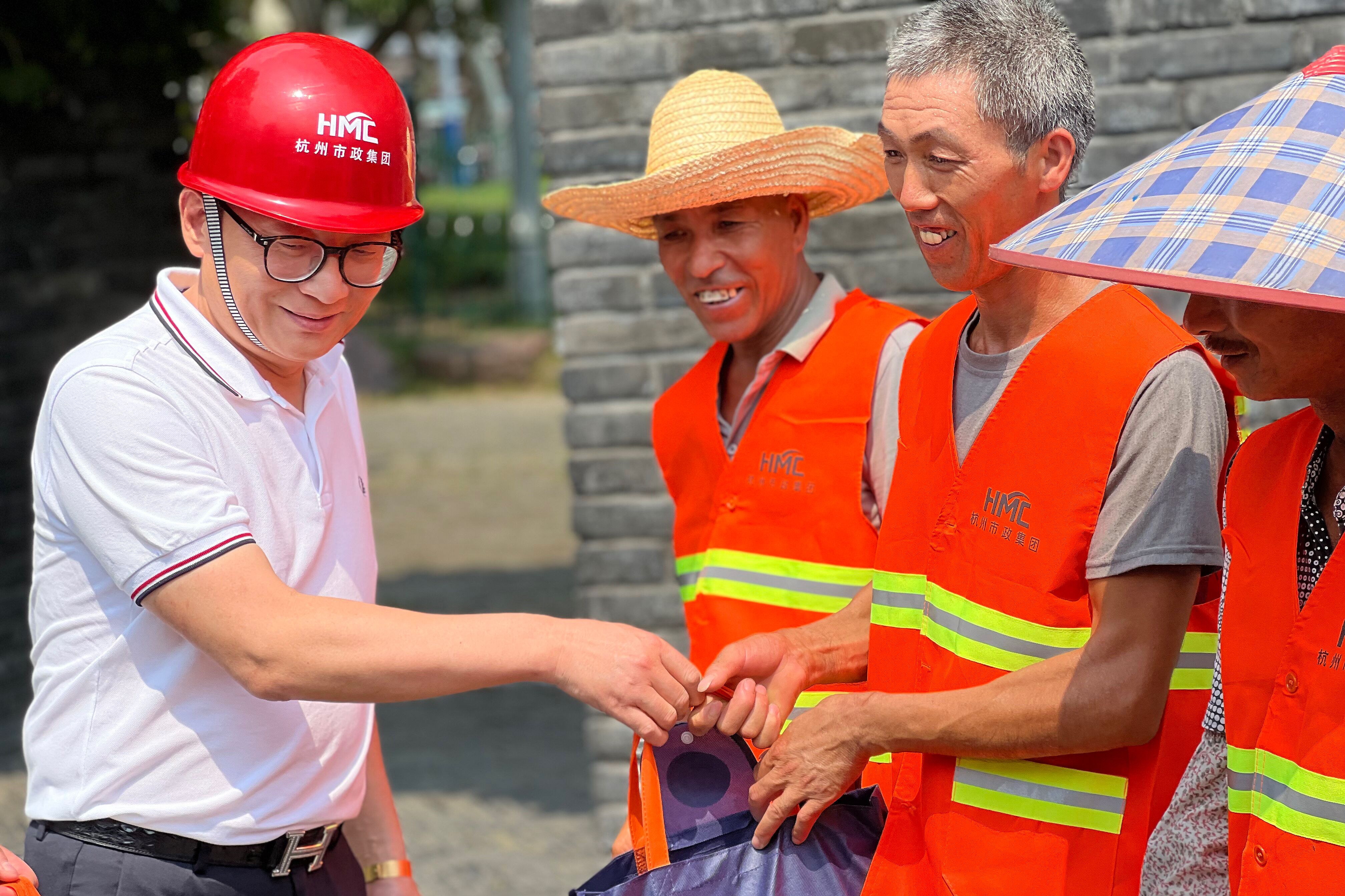 在嘉善项目现场,王欢、程澄、方赤华将慰问品送到作业人员手中,感谢他们为城市设施养护运营付出的辛勤劳动,叮嘱大家在做好本职工作的同时,要特别注意防暑降温,落实劳动防护,保重身体健康。