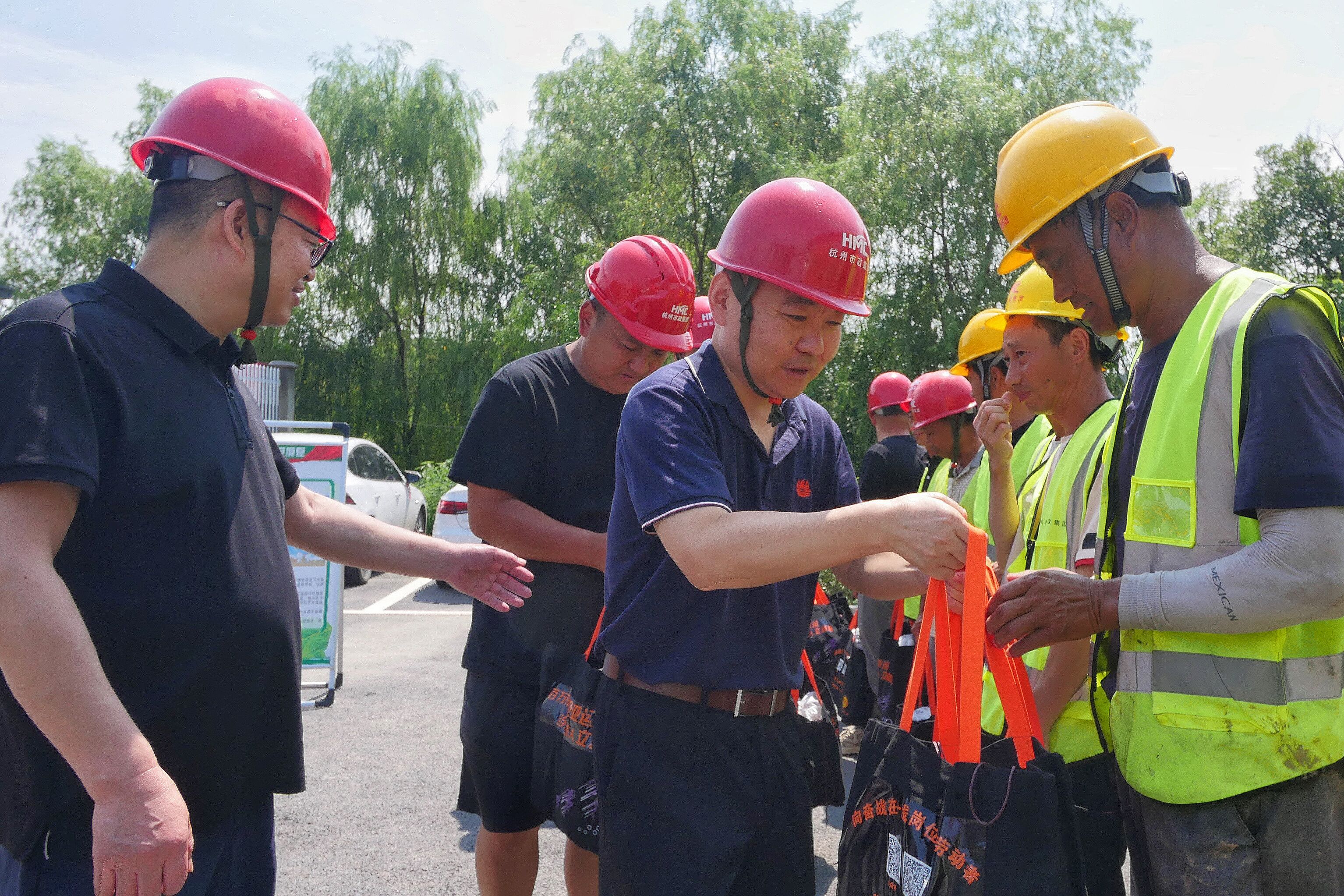 薛明君主任一行向高温天气下坚守岗位、为城市建设挥洒汗水的民工兄弟表示感谢,并将高温慰问品一一送到大家手中。薛主任还向施工人员详细询问身体状况,叮嘱他们要注意自我保护,防止高温中暑;并听取了项目部有关工程概况及安全生产、防暑降温工作情况汇报,对项目部的工作给予充分肯定,要求科学安排作息时间,落实各项防暑措施,确保人员平安度夏。